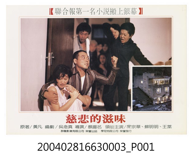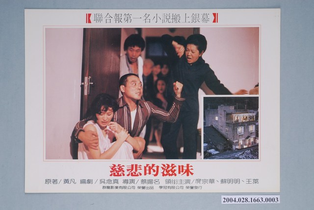 本件劇照上方搭配文案「聯合報第一名小說搬上銀幕」,下方則另有中文片名「慈悲的滋味」,以及「原著 / 黃凡。編劇 / 吳念真。導演 / 蔡揚名。領銜主演 / 庹宗華、蘇明明、王萊」,「群龍影業有限公司出品、學冠有限公司榮譽發行」等字樣。