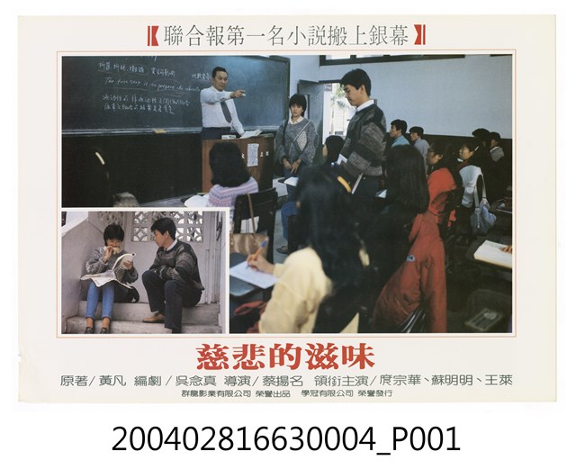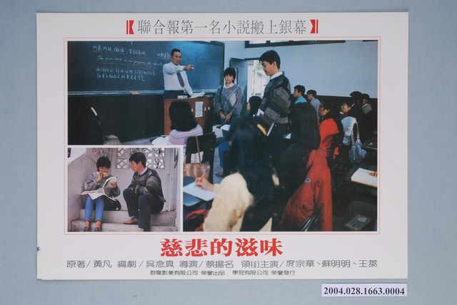 本件劇照上方搭配文案「聯合報第一名小說搬上銀幕」,下方則另有中文片名「慈悲的滋味」,以及「原著 / 黃凡。編劇 / 吳念真。導演 / 蔡揚名。領銜主演 / 庹宗華、蘇明明、王萊」,「群龍影業有限公司出品、學冠有限公司榮譽發行」等字樣。