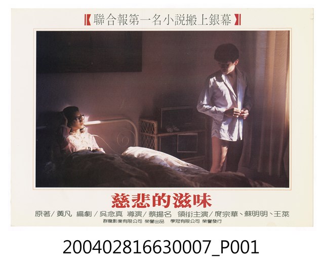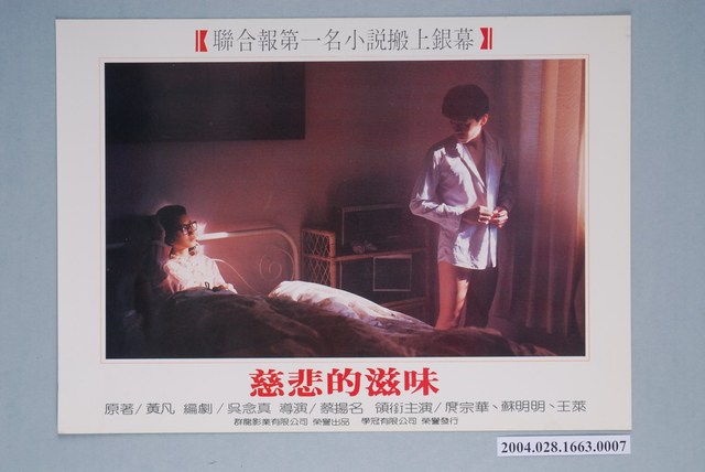 本件劇照上方搭配文案「聯合報第一名小說搬上銀幕」,下方則另有中文片名「慈悲的滋味」,以及「原著 / 黃凡。編劇 / 吳念真。導演 / 蔡揚名。領銜主演 / 庹宗華、蘇明明、王萊」,「群龍影業有限公司出品、學冠有限公司榮譽發行」等字樣。