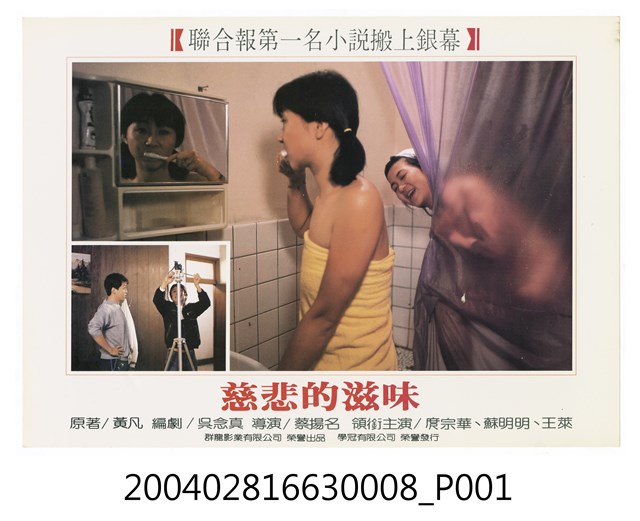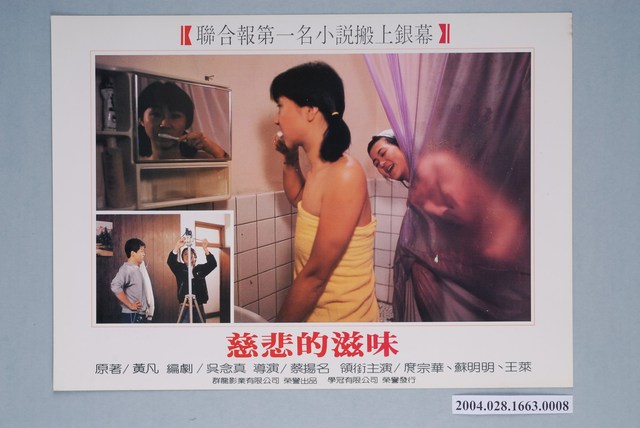 本件劇照上方搭配文案「聯合報第一名小說搬上銀幕」,下方則另有中文片名「慈悲的滋味」,以及「原著 / 黃凡。編劇 / 吳念真。導演 / 蔡揚名。領銜主演 / 庹宗華、蘇明明、王萊」,「群龍影業有限公司出品、學冠有限公司榮譽發行」等字樣。