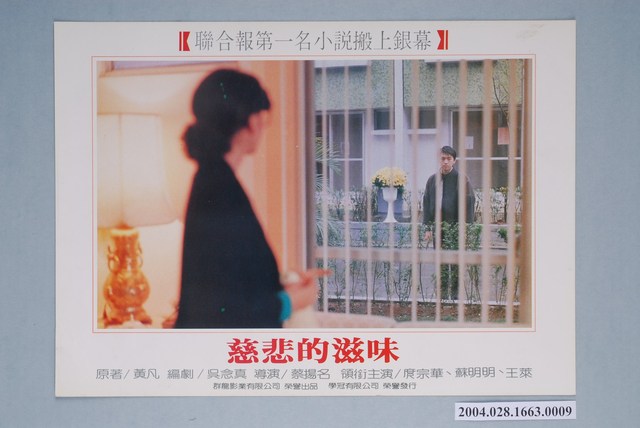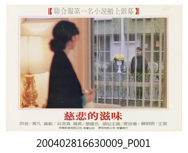 本件劇照上方搭配文案「聯合報第一名小說搬上銀幕」,下方則另有中文片名「慈悲的滋味」,以及「原著 / 黃凡。編劇 / 吳念真。導演 / 蔡揚名。領銜主演 / 庹宗華、蘇明明、王萊」,「群龍影業有限公司出品、學冠有限公司榮譽發行」等字樣。
