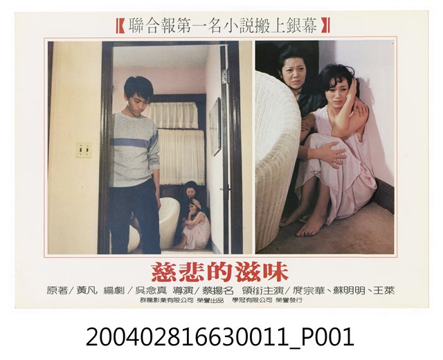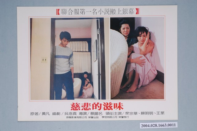 臺灣電影《慈悲的滋味》彩色印刷劇照,有左、右2張劇照,左側為在室內的男主角庹宗華正站立倚在門邊,而女主角蘇明明則哭泣坐在角落倚身在飾演女傭的陳淑芳懷中。右側則為身著睡衣的蘇明明正哀傷坐地上的模樣、其身後則是女傭。