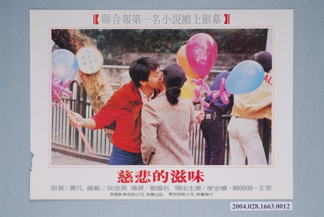 本件劇照上方搭配文案「聯合報第一名小說搬上銀幕」,下方則另有中文片名「慈悲的滋味」,以及「原著 / 黃凡。編劇 / 吳念真。導演 / 蔡揚名。領銜主演 / 庹宗華、蘇明明、王萊」,「群龍影業有限公司出品、學冠有限公司榮譽發行」等字樣。