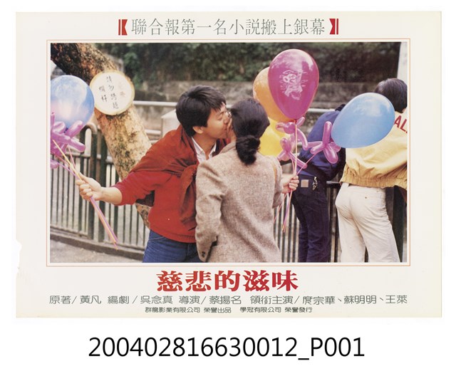臺灣電影《慈悲的滋味》彩色印刷劇照,內容在動物園場景,男主角庹宗華正手執彩色氣球並開心吻著蘇明明臉頰的模樣。