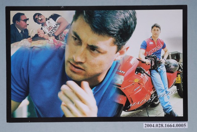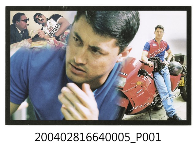 香港電影《至激殺人犯》彩色印刷劇照,內容為三張合成照,置中主要為飾演警察的男主角王敏德正做沉思貌,右方是他站倚機車旁的模樣,而左上方則搭配他與鄭則仕扮裝搞笑的樣子。