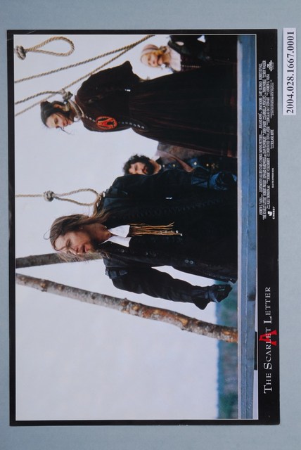 美國電影《真愛一生》在臺灣上映發行的彩色印刷劇照,照片上右側是女主角黛咪摩爾(Demi Moore)身穿鮮紅A字在身上,而脖上則正圈著吊繩的模樣,左方則是飾演牧師男主角蓋瑞歐德曼(Gary Oldman)。