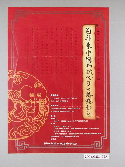 2004.028.1728 跨世紀文化反省與展望系列論壇:百年來中國知識份子之思想特色海報
