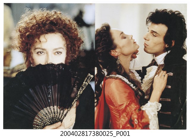 1.電影《絕代豔姬》在臺灣上映宣傳發行的彩色印刷劇照,左方照片上為女主角艾莎賽伯斯坦手持黑扇遮臉的模樣;而右方照片則是她閉眼靠向男主角史提法諾戴尼斯的樣子。《絕代豔姬》為1994年比利時、義大利、法國合製出品的傳記電影,由史提法諾戴尼斯主演,描述18世紀義大利美聲閹伶費里尼利的傳奇歌唱生涯及成長經歷故事。本片獲1995年金球獎最佳外語片,以及奧斯卡最佳外語片提名。