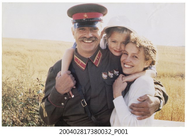 俄國電影《烈日灼身》在臺灣上映宣傳發行的彩色印刷劇照,照片上為劇中一家三口在草原上互摟而笑的模樣,左方為飾演父親的男主角兼導演尼基塔米哈爾科夫,置中是飾演小女主角的娜迪達米哈爾科夫,右方則是飾演母親的伊格布亞。本片由真實故事所改編而成,由尼基塔.米哈爾科夫執導,以1936年史達林清黨前夕的俄國為時代背景,藉由一位小女孩娜迪雅的眼中,看見自己和樂的家庭因為母親的舊情人闖入而遭到迫害,是一部政治寓意濃厚的作品,並榮獲1995年奧斯卡最佳外語片。