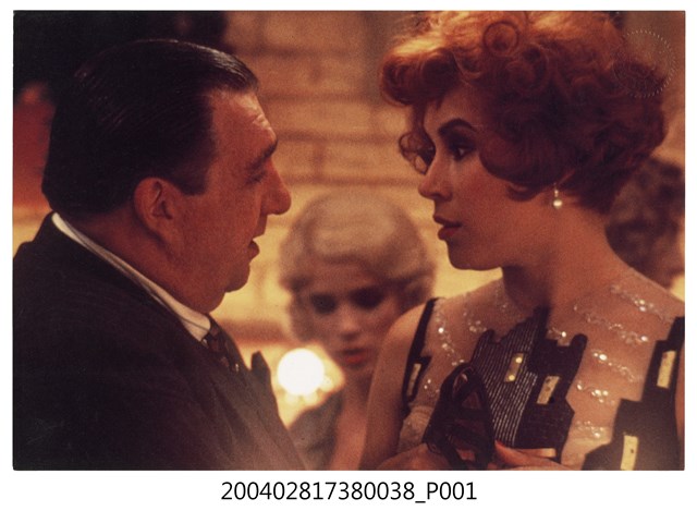 1.美國電影《百老匯上空子彈》在臺灣上映宣傳發行的彩色印刷劇照,照片上右方為女配角珍妮佛提莉正與左方男子說話的模樣。《百老匯上空子彈》為1994年出品的劇情片,由伍迪艾倫執導,約翰庫薩克、黛安韋斯特、珍妮佛提莉等主演,描述一名年輕劇作家為在百老匯發表作品,決定接受來自黑手黨的資金,並讓幫派大哥的女友擔任劇中女配角,於是引起一連串出人意表的故事。