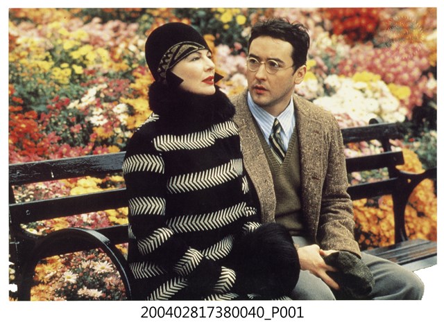 1.美國電影《百老匯上空子彈》在臺灣上映宣傳發行的彩色印刷劇照,照片上為飾演男女主角的約翰庫薩克及黛安韋斯特,兩人正坐在花團錦簇公園的一張椅子上談話的模樣。《百老匯上空子彈》為1994年出品的劇情片,由伍迪艾倫執導,約翰庫薩克、黛安韋斯特、珍妮佛提莉等主演,描述一名年輕劇作家為在百老匯發表作品,決定接受來自黑手黨的資金,並讓幫派大哥的女友擔任劇中女配角,於是引起一連串出人意表的故事。