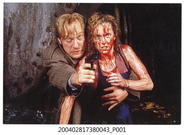 1.電影《猛鬼工廠》在臺灣上映宣傳發行的彩色印刷劇照,照片上左方為飾演偵探的泰德里凡正一手持槍瞄準前方目標、一手摟住其旁臉上及身上均是血跡的女子。《猛鬼工廠》為1995年英國與南非合製出品的恐怖片,由羅勃英格蘭、泰德里凡等主演,描述一間洗衣店發生了離奇命案,男偵探前往調查才發現這是店主為求生意興隆、而與魔鬼交易獻祭活人所引發的一連串命案故事。