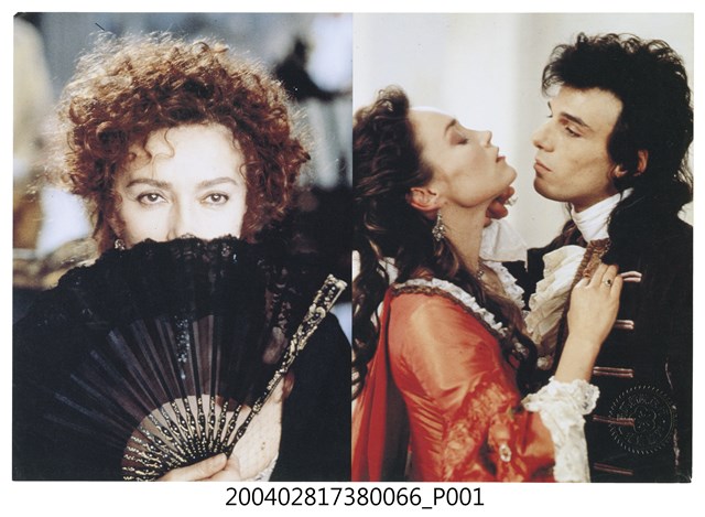 1.電影《絕代豔姬》在臺灣上映宣傳發行的彩色印刷劇照,左方照片上為女主角艾莎賽伯斯坦手持黑扇遮臉的模樣;而右方照片則是她閉眼靠向男主角史提法諾戴尼斯的樣子。《絕代豔姬》為1994年比利時、義大利、法國合製出品的傳記電影,由史提法諾戴尼斯主演,描述18世紀義大利美聲閹伶費里尼利的傳奇歌唱生涯及成長經歷故事。本片獲1995年金球獎最佳外語片,以及奧斯卡最佳外語片提名。