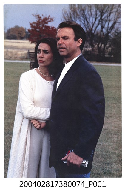 1.美國電影《戰慄黑洞》在臺灣上映宣傳發行的彩色印刷劇照,照片上右方為飾演男主角的山姆尼爾,他與女主角茱莉卡門正站立在室外草地上。《戰慄黑洞》為1994年出品的恐怖片,由約翰卡本特執導,山姆尼爾、茱莉卡門主演,描述一位保險調查員及出版社女編輯,一同前往小鎮為尋找失蹤的暢銷作家,卻發現鎮上所發生的謀殺案竟與小說內容不謀而合的驚悚故事。