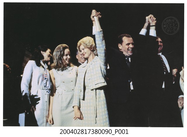 1.美國電影《白宮風暴》在臺灣上映宣傳發行的彩色印刷劇照,照片上為飾演尼克森總統的男主角安東尼霍普金斯,正在勝選舞臺上高舉雙手感謝民眾支持的模樣;其旁為飾演其妻的美國女演員瓊愛倫。《白宮風暴》為1995年出品的美國傳記電影,由奧利佛史東執導,安東尼霍普金斯主演,描述美國總統尼克森從童年時代、至擔任美國總統後卻因政治醜聞「水門案」而請辭下臺的故事。本片並榮獲奧斯卡獎四項提名。