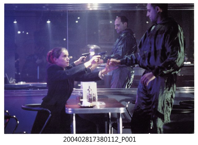 1.英國電影《真情俘虜》在臺灣上映宣傳發行的彩色印刷劇照,照片上為女主角茱莉亞歐蒙正手持短槍瞄準一男子的模樣。《真情俘虜》為1994年出品的劇情片,由茱莉亞歐蒙、提姆羅斯主演,描述一名女牙醫在巡診時與監獄囚犯相愛,因而引發一連串混亂事件的故事。