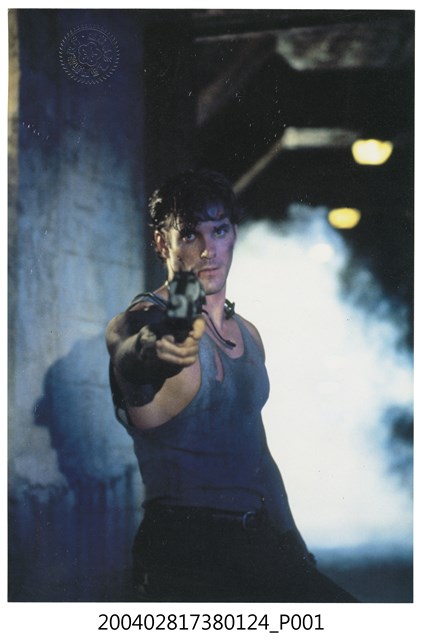 1.電影《魔蠍先鋒》在臺灣上映宣傳發行的彩色印刷劇照,照片上左方為飾演男主角的麥特麥可倫正手執黑色長槍指向前方的模樣。《魔蠍先鋒》為1994年美國及加拿大出品的美國動作片,由麥特麥可倫及珍妮佛魯賓主演,描述一組特種菁英戰士滲透入右翼狂熱份子組織,阻撓其暴力行動的故事。