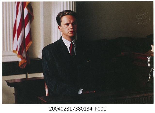 1.美國電影《刺激1995》在臺灣上映宣傳發行的彩色印刷劇照,照片上為飾演男主角的提姆羅賓斯,他正西裝筆挺坐在某公署內景的椅子上,面無表情之貌。《刺激1995》為1994年出品的美國劇情片,法蘭克戴瑞邦(Frank Darabont)導演,提姆羅賓斯、摩根費里曼等主演,改編自史蒂芬金的原著小說,描述一位被控殺妻含冤入獄的銀行家,在二十年的鐵窗生涯後,決心逃獄的故事。