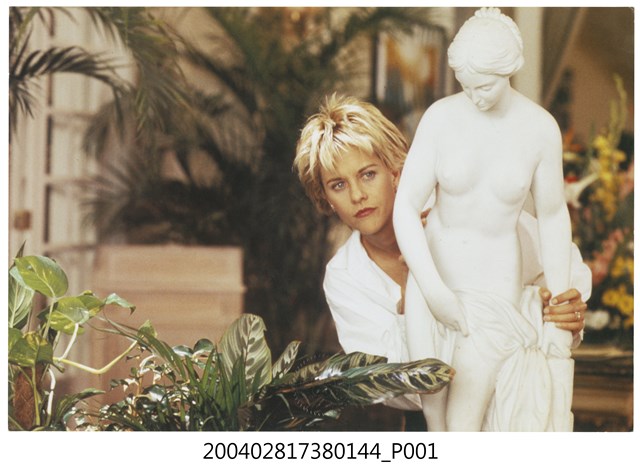 1.美國電影《情定巴黎》在臺灣上映宣傳發行的彩色印刷劇照,照片上為飾演女主角的梅格萊恩正躲在一白色雕像後方做窺視貌。《情定巴黎》為1995年出品的愛情喜劇,由梅格萊恩、凱文克萊、提摩西赫頓主演,描述一名患有飛行恐懼症的女子,遠從加拿大飛到坎城為了贏回出軌未婚夫的心,卻在飛機上遇見了一位英俊法國盜賊的故事。