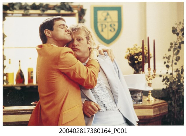 1.美國電影《阿呆與阿瓜》在臺灣上映宣傳發行的彩色印刷劇照,照片上為兩位男主角金凱瑞、傑夫丹尼斯正站立在室內,左側金凱瑞正摟包右側傑夫丹尼斯的模樣。《阿呆與阿瓜》為1994年出品的美國喜劇片,由金凱瑞、傑夫丹尼爾、蘿倫荷莉主演,描述兩個傻瓜想盡辦法要將一個裝滿鈔票的手提箱還給其女主人所引發的一連串趣事。