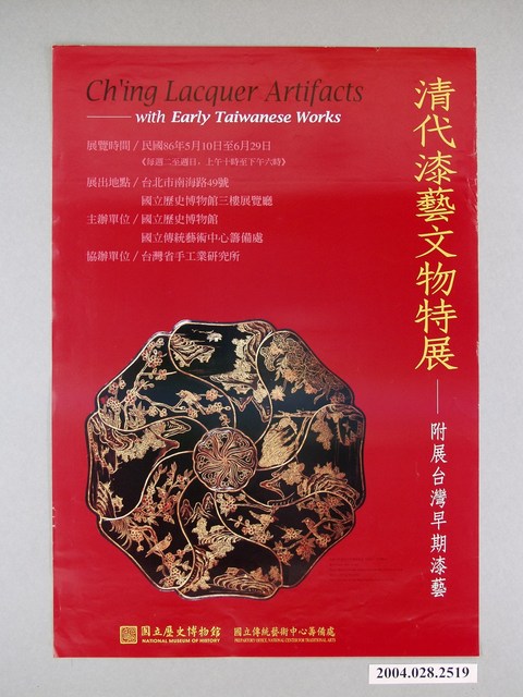 2004.028.2519 國立歷史博物館以及國立傳統藝術中心籌備處辦理「清代漆藝文物特展-附展台灣早期漆藝」海報