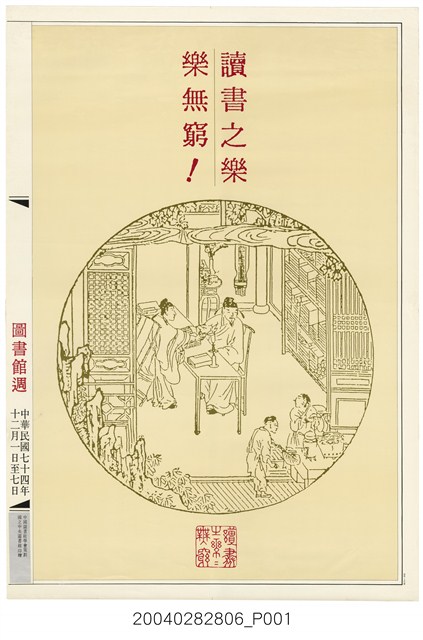 1.本件為「讀書之樂樂無窮海報」,上緣兩個角落有摺痕,下緣捲曲,海報直式,形式仿宋版線裝書內頁,以白色塊為邊,作為主要資訊欄;以米白色塊為主要內容。仿雙魚尾之處,有副標「圖書館週」、展覽日期、中國圖書館學會策劃、國立中央圖書館印贈等資訊。2.米色塊中的主題「讀書之樂樂無窮海報」仿紅印,兩行直書置於上方,中央以一圓形仿窗花形式的讀書圖呼應主題,最下方有一「讀書之樂樂無窮」之仿鈐印之痕。