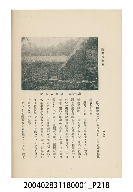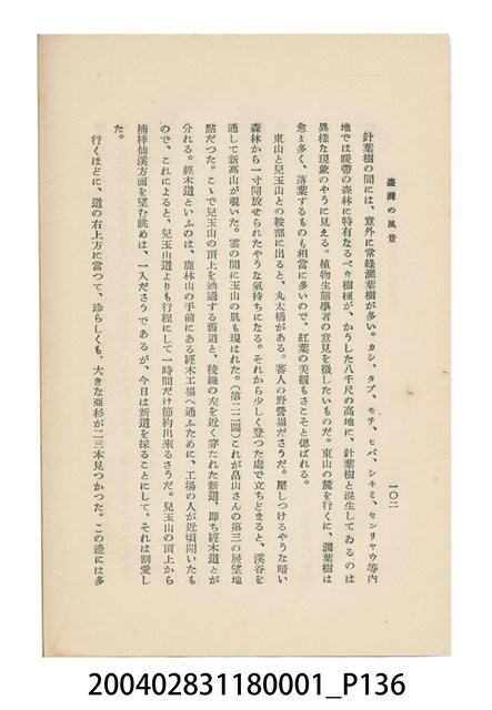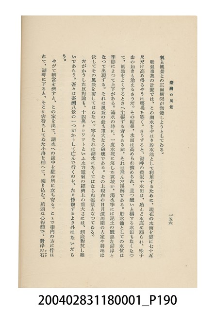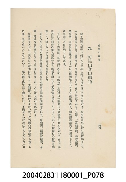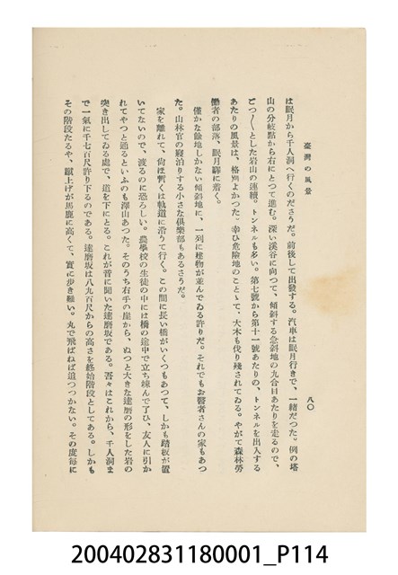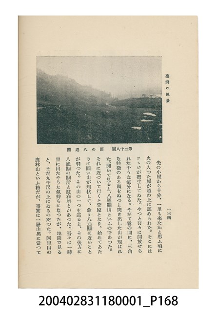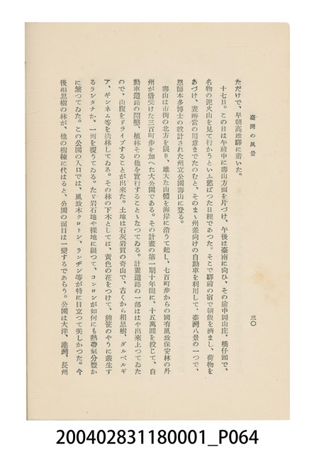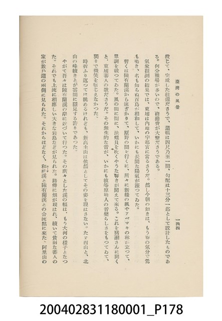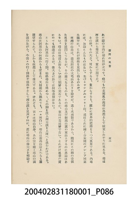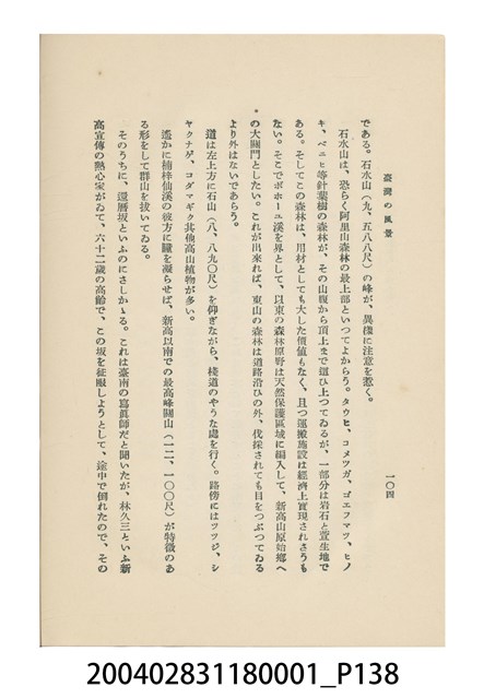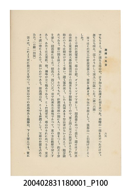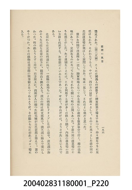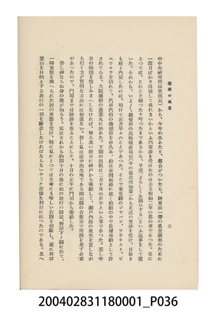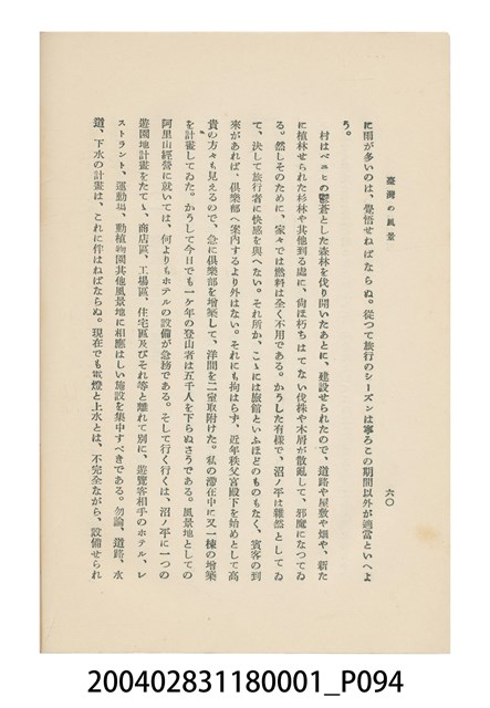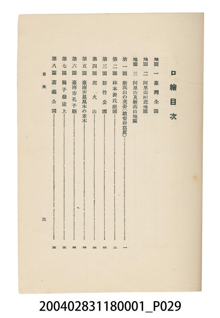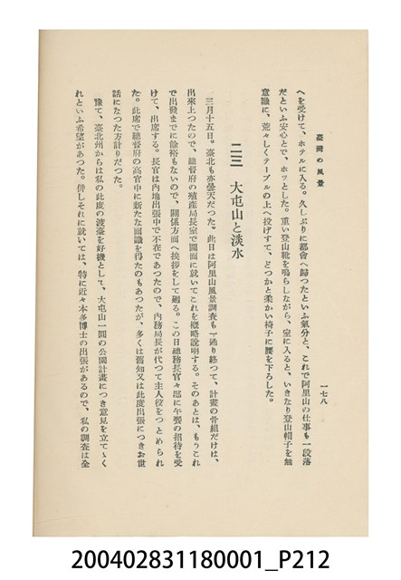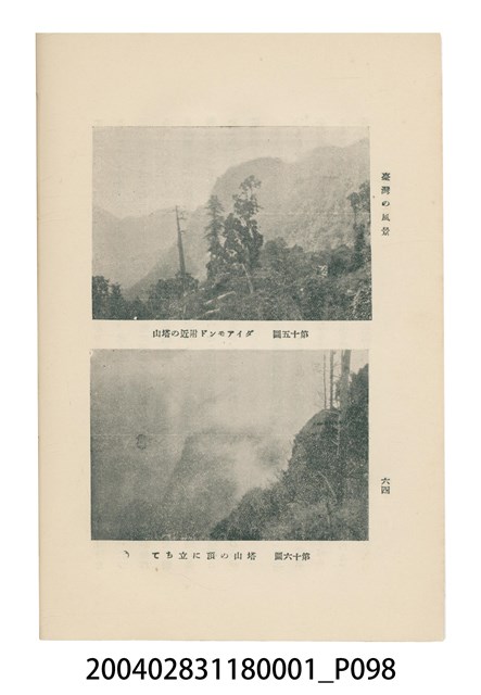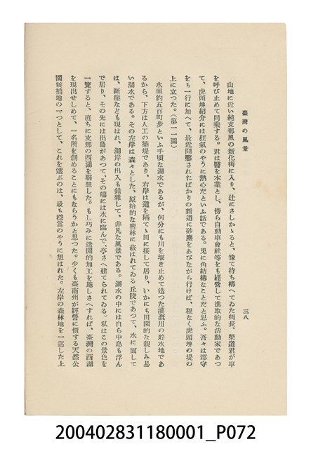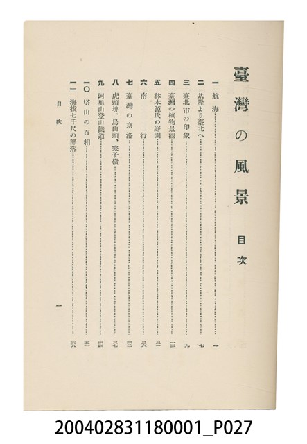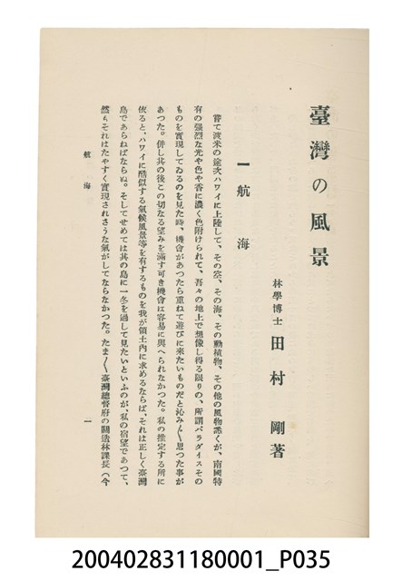 本物件為發行於昭和3年(1928)之《臺灣的風景》,為林學博士田村剛所著。其書殼上有「雄山閣圖書出版株式會社」的標籤以及「定價壹圓八十錢」的印戳。其封面及封裡有臺灣風景的彩色圖繪,畫風筆觸簡約,留白處多。其收錄了白底黑色線條之臺灣全圖、新高山及阿里山附近地圖,以及26張口繪圖,例如:林本源氏庭園、新竹公園、泥火山、、臺南市孔子廟、嘉義公園、雲海的獨立山、二萬坪的塔山、生蕃的家等。其他插圖共三十六張,例如:臺灣人的家、吳子諭氏庭院、陳有蘭溪、虎頭埤、吳氏庭院、男女島等。其內容章節包括:航海;基隆到臺北;臺北市的印象臺灣的植物景觀;林本源氏的庭院;南行;臺灣的京洛;虎頭埤、烏山頭、寒子嶺;阿里山登山鐵道;塔山的百相;海拔七千尺的部落;塔山及後藤山;祝山及對高岳;香雪山及萬歲山;眠月及千人洞;生蕃部落;鹿林山的山中小屋;新高山中首祭的歌;新高登山的冒險;日月潭的杵音;阿里山的風景計畫;臺中的一日;大屯山及淡水;下關的遭難等。