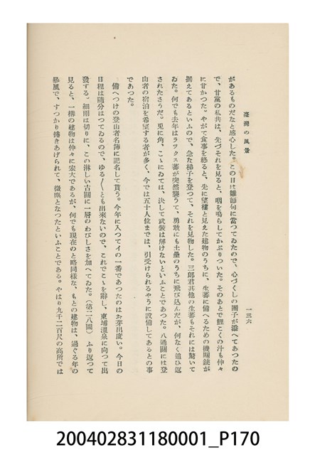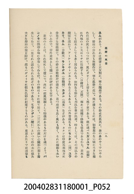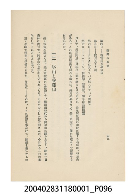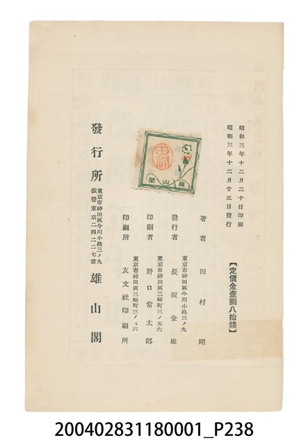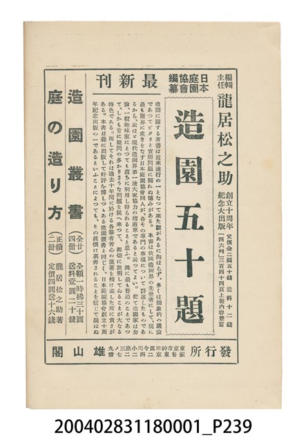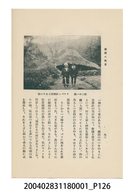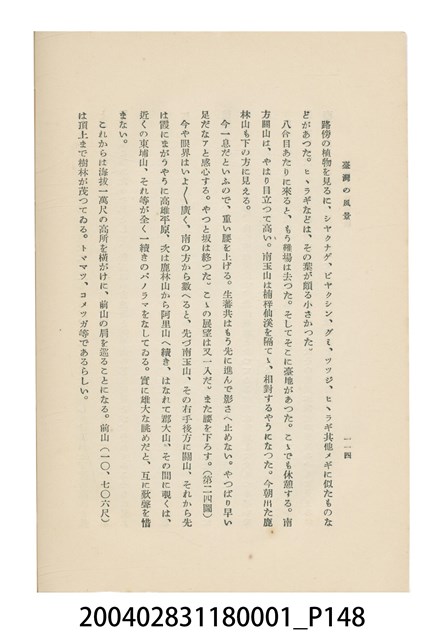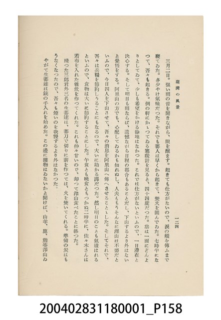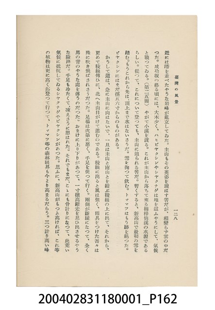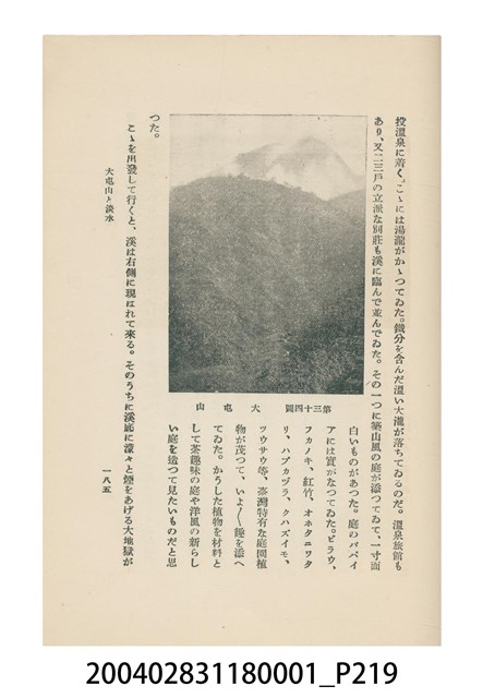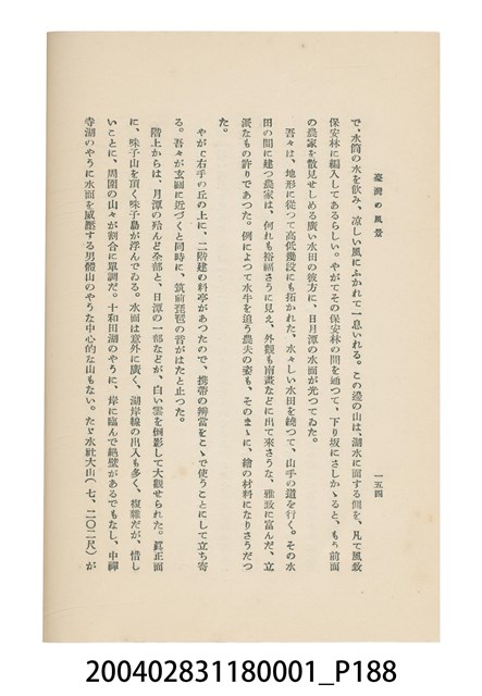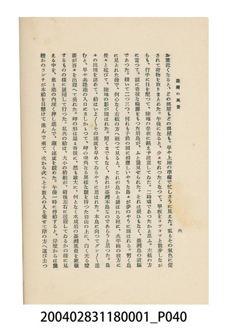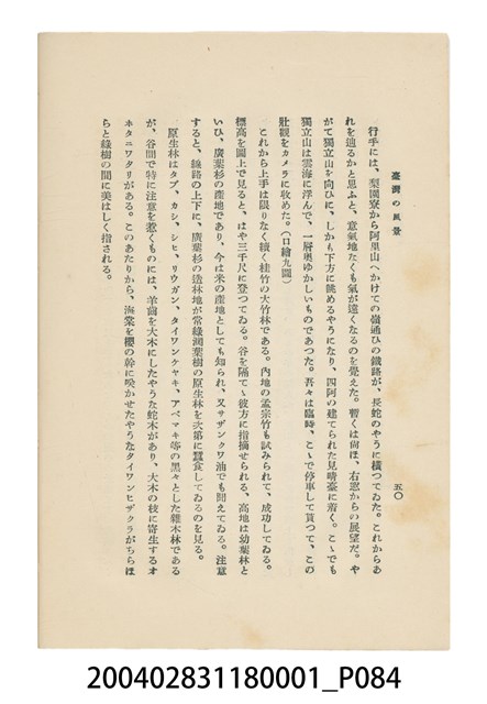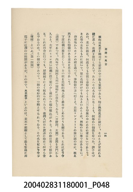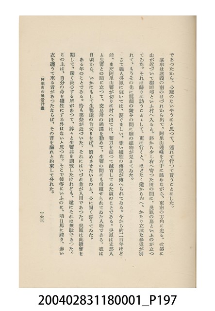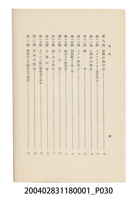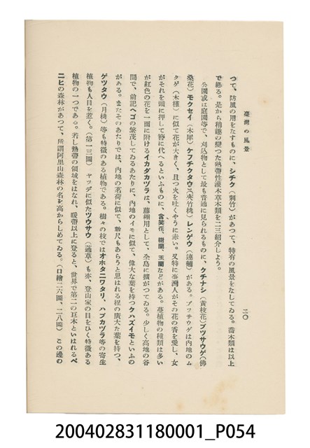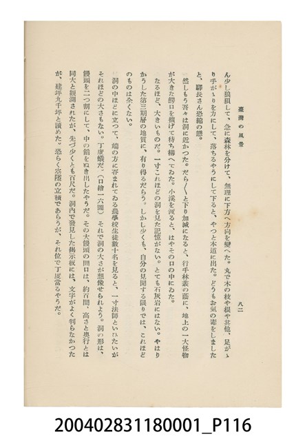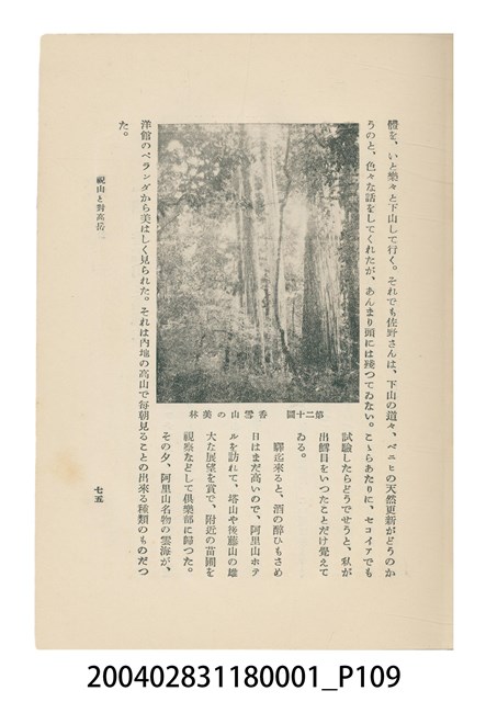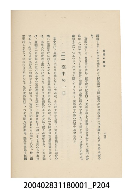 本物件為發行於昭和3年(1928)之《臺灣的風景》,為林學博士田村剛所著。其書殼上有「雄山閣圖書出版株式會社」的標籤以及「定價壹圓八十錢」的印戳。其封面及封裡有臺灣風景的彩色圖繪,畫風筆觸簡約,留白處多。其收錄了白底黑色線條之臺灣全圖、新高山及阿里山附近地圖,以及26張口繪圖,例如:林本源氏庭園、新竹公園、泥火山、、臺南市孔子廟、嘉義公園、雲海的獨立山、二萬坪的塔山、生蕃的家等。其他插圖共三十六張,例如:臺灣人的家、吳子諭氏庭院、陳有蘭溪、虎頭埤、吳氏庭院、男女島等。其內容章節包括:航海;基隆到臺北;臺北市的印象臺灣的植物景觀;林本源氏的庭院;南行;臺灣的京洛;虎頭埤、烏山頭、寒子嶺;阿里山登山鐵道;塔山的百相;海拔七千尺的部落;塔山及後藤山;祝山及對高岳;香雪山及萬歲山;眠月及千人洞;生蕃部落;鹿林山的山中小屋;新高山中首祭的歌;新高登山的冒險;日月潭的杵音;阿里山的風景計畫;臺中的一日;大屯山及淡水;下關的遭難等。
