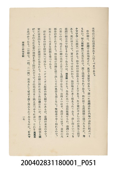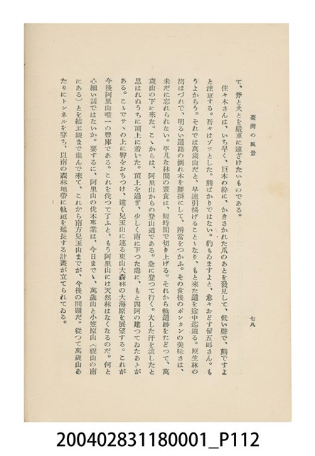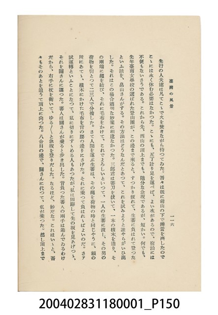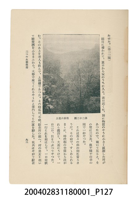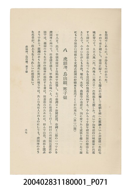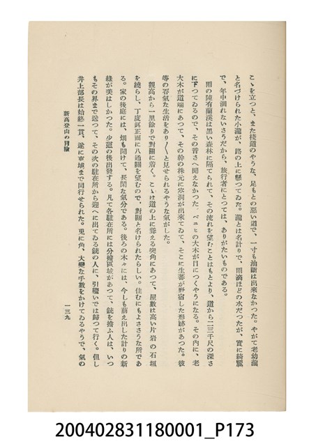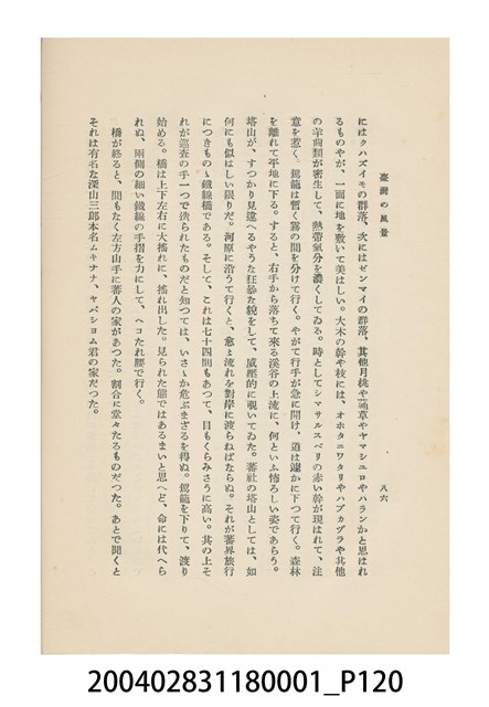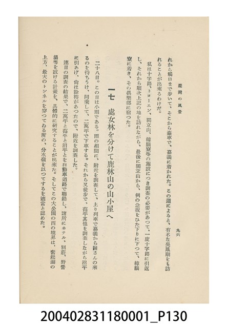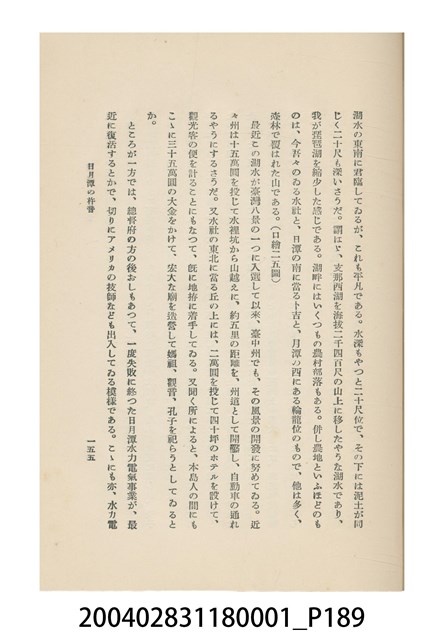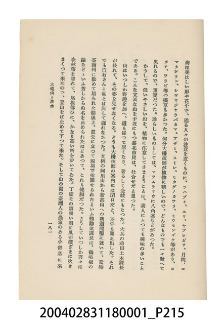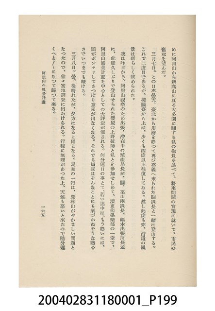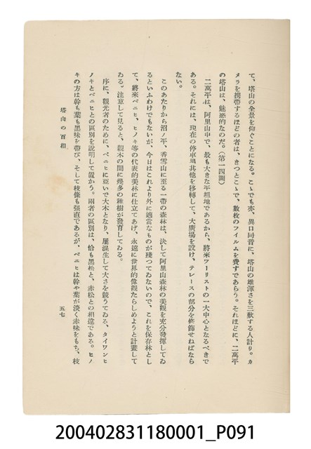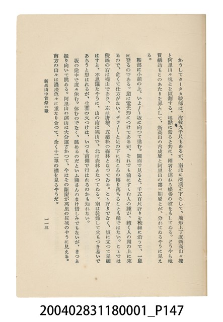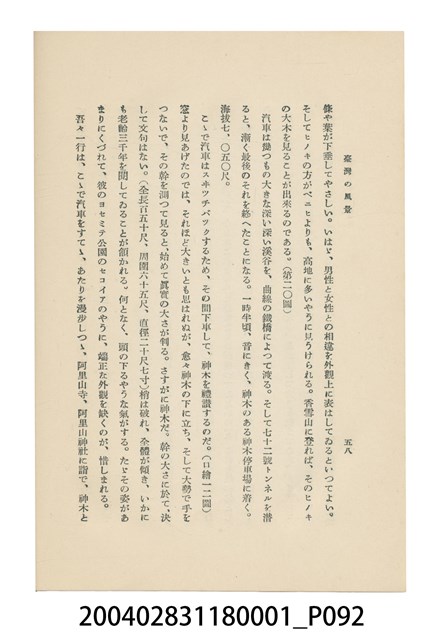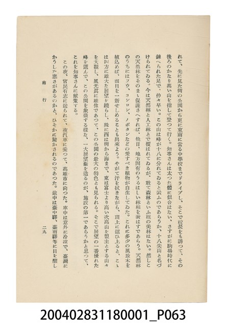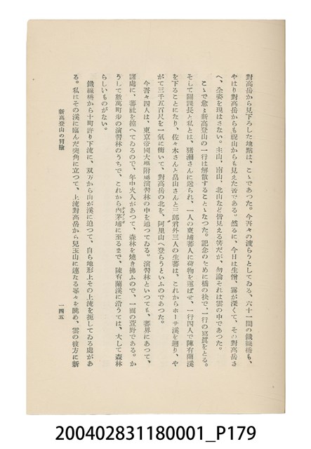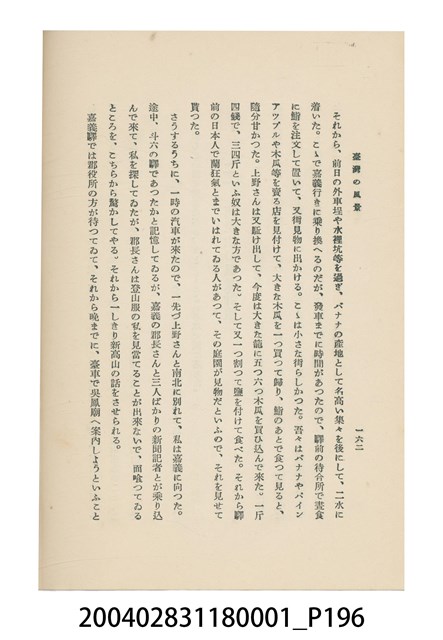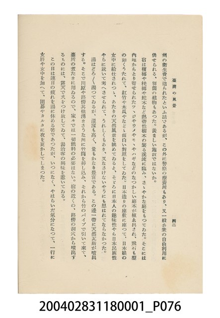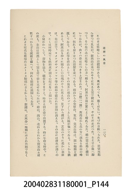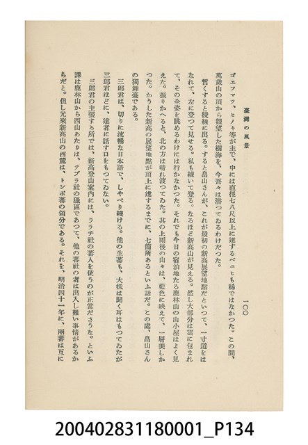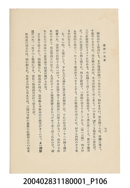 本物件為發行於昭和3年(1928)之《臺灣的風景》,為林學博士田村剛所著。其書殼上有「雄山閣圖書出版株式會社」的標籤以及「定價壹圓八十錢」的印戳。其封面及封裡有臺灣風景的彩色圖繪,畫風筆觸簡約,留白處多。其收錄了白底黑色線條之臺灣全圖、新高山及阿里山附近地圖,以及26張口繪圖,例如:林本源氏庭園、新竹公園、泥火山、、臺南市孔子廟、嘉義公園、雲海的獨立山、二萬坪的塔山、生蕃的家等。其他插圖共三十六張,例如:臺灣人的家、吳子諭氏庭院、陳有蘭溪、虎頭埤、吳氏庭院、男女島等。其內容章節包括:航海;基隆到臺北;臺北市的印象臺灣的植物景觀;林本源氏的庭院;南行;臺灣的京洛;虎頭埤、烏山頭、寒子嶺;阿里山登山鐵道;塔山的百相;海拔七千尺的部落;塔山及後藤山;祝山及對高岳;香雪山及萬歲山;眠月及千人洞;生蕃部落;鹿林山的山中小屋;新高山中首祭的歌;新高登山的冒險;日月潭的杵音;阿里山的風景計畫;臺中的一日;大屯山及淡水;下關的遭難等。