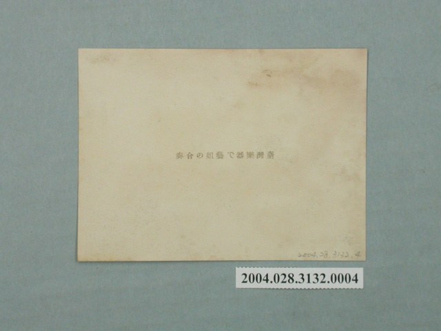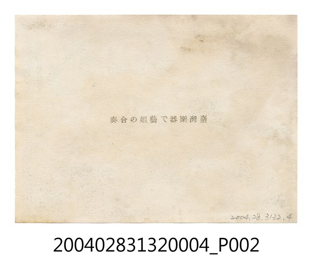 本件為小野尚美堂發行以 「臺灣印象」為題的一組明信片,本明信片封套以臺灣女性腳踩高跟鞋手持傘置於肩上,並有椰子樹等熱帶植栽為背景,封套載有「IMPRESSION FOR FORMOSA」、「臺灣美人.其他」、「臺灣の印象」、「說明入」、「趣味の小型寫真」、「十枚一組」、「不許複製」、「小野尚美堂發行」等字樣。本照片主題為臺灣藝姊之合奏,詳細的拍攝地點與時間不明,照片正面有五名女性身著樣式不一的服飾並各持有不同的樂器採坐姿拍攝而成,照片背面則有「臺灣樂器で藝姐の合奏」字樣。