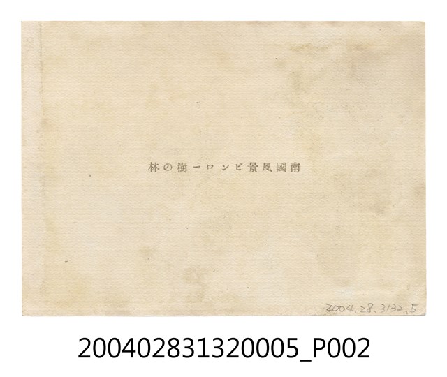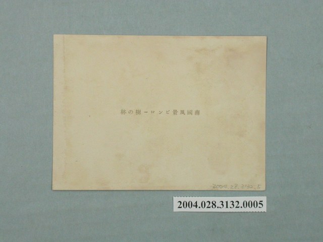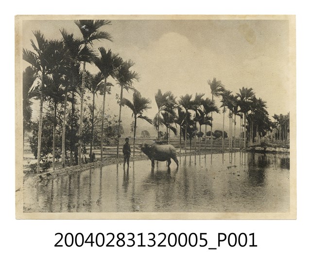 本件為小野尚美堂發行以 「臺灣印象」為題的一組明信片,本明信片封套以臺灣女性腳踩高跟鞋手持傘置於肩上,並有椰子樹等熱帶植栽為背景,封套載有「IMPRESSION FOR FORMOSA」、「臺灣美人.其他」、「臺灣の印象」、「說明入」、「趣味の小型寫真」、「十枚一組」、「不許複製」、「小野尚美堂發行」等字樣。本照片主題為臺灣檳榔樹,詳細的拍攝地點與時間不明,照片正面有一名男性轎夫及牛隻,並有許多檳榔樹分布其中以展現臺灣的南國風情,照片背面則有「南國風景ピンロ-樹の林」字樣。