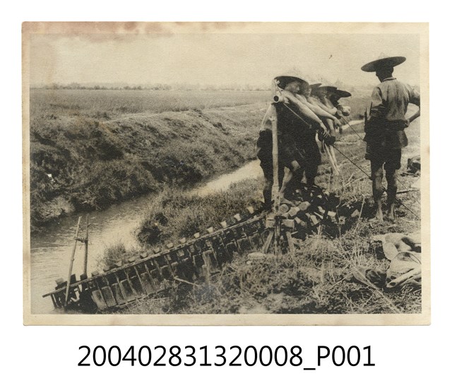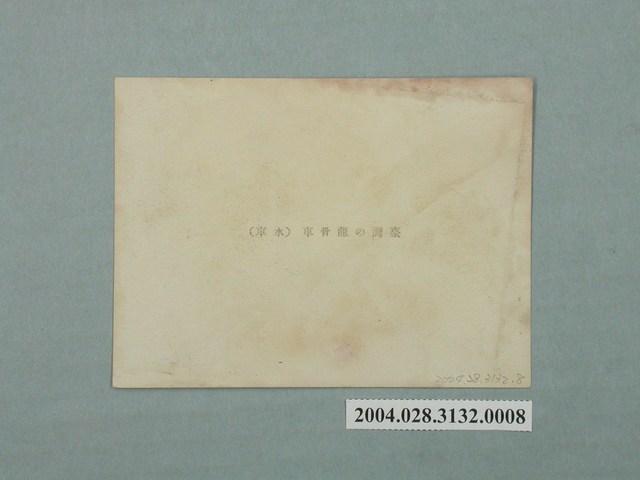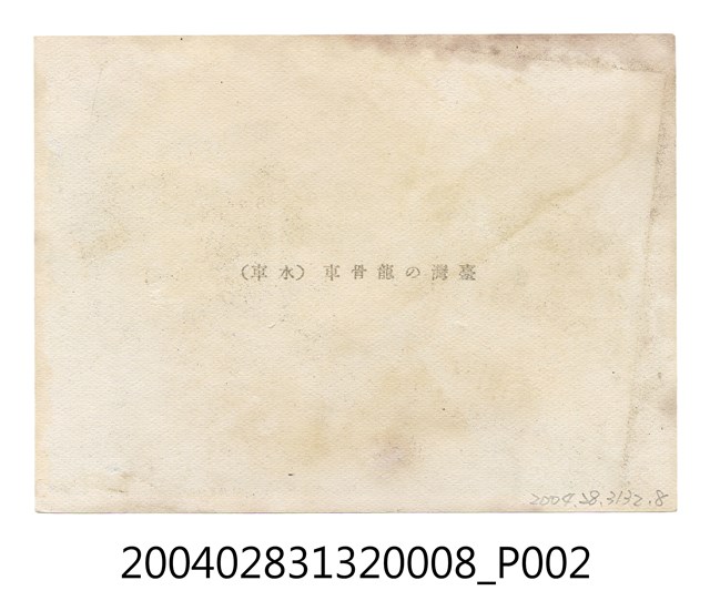 本件為小野尚美堂發行以 「臺灣印象」為題的一組明信片,本明信片封套以臺灣女性腳踩高跟鞋手持傘置於肩上,並有椰子樹等熱帶植栽為背景,封套載有「IMPRESSION FOR FORMOSA」、「臺灣美人.其他」、「臺灣の印象」、「說明入」、「趣味の小型寫真」、「十枚一組」、「不許複製」、「小野尚美堂發行」等字樣。本照片主題為龍骨車,照片正面可見臺灣的農村景象,但詳細的拍攝地點與時間不明,照片可見幾名農村男性在踩踏龍骨車,照片背面則有「臺灣の龍骨車」、「(水車)」字樣。