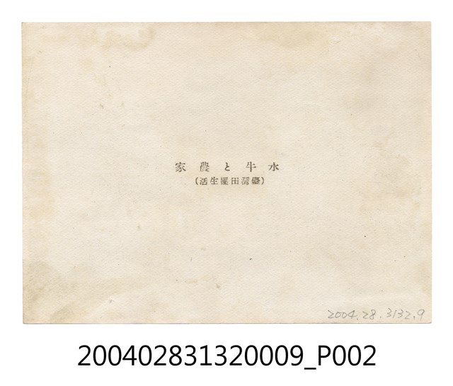 本件為小野尚美堂發行以 「臺灣印象」為題的一組明信片,本明信片封套以臺灣女性腳踩高跟鞋手持傘置於肩上,並有椰子樹等熱帶植栽為背景,封套載有「IMPRESSION FOR FORMOSA」、「臺灣美人.其他」、「臺灣の印象」、「說明入」、「趣味の小型寫真」、「十枚一組」、「不許複製」、「小野尚美堂發行」等字樣。本照片主題為水牛與農家,照片正面可見臺灣的農村景象,但詳細的拍攝地點與時間不明,照片後方可見一磚照平房,畫面前方則有兩名男性手持鋤頭及牽牛隻,並有一名孩頭手牽繩綁有一頭水牛於前方池中,照片背面則有「水牛と農家」、「(臺灣田園生活)」字樣。