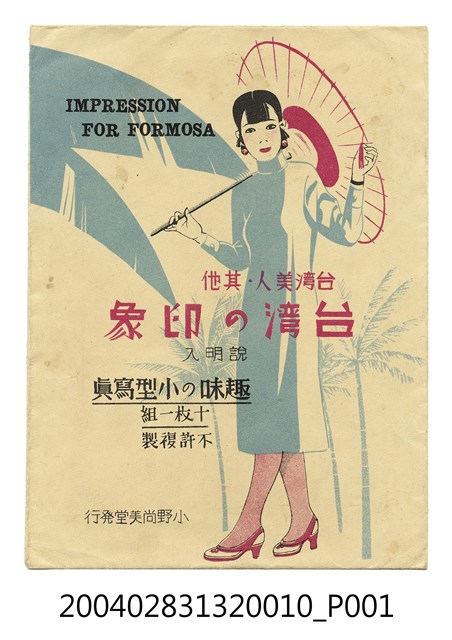本件為小野尚美堂發行以 「臺灣印象」為題的一組明信片,本明信片封套以臺灣女性腳踩高跟鞋手持傘置於肩上,並有椰子樹等熱帶植栽為背景,封套載有「IMPRESSION FOR FORMOSA」、「臺灣美人.其他」、「臺灣の印象」、「說明入」、「趣味の小型寫真」、「十枚一組」、「不許複製」、「小野尚美堂發行」字樣。