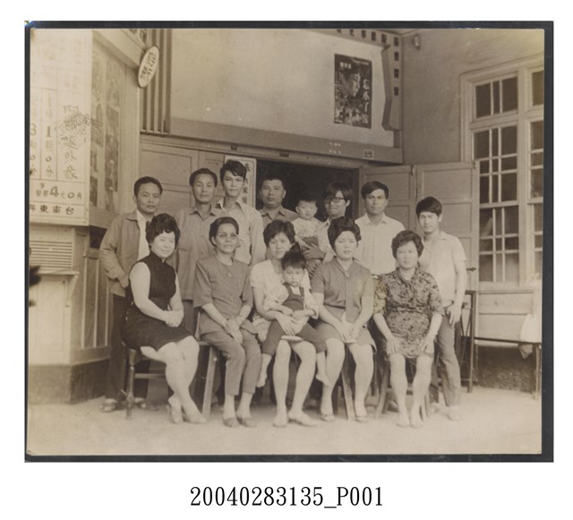 1. 臺灣臺南家族黑白合照,橫式單面,照片中一座老戲院面前,推測應於家族合照,中間則一位婦女抱著一位小孩,前排坐在椅子上的皆為婦女,後方應於男士們,共有12大人,2為小孩的合照,背景為一戲院門口,推測是座落於臺南東興路的老戲院,戲院上方則有一部電影海報為《忘不了妳》,主視覺為女主角深情款款的側臉。照片還算清晰,色彩為老照片所以偏黃,左邊版面表面則有一點污痕。2.從後方電影海報推測的年代應於1968年上映的《忘不了你》,導演周旭江、唐寶雲、秦沛主演。