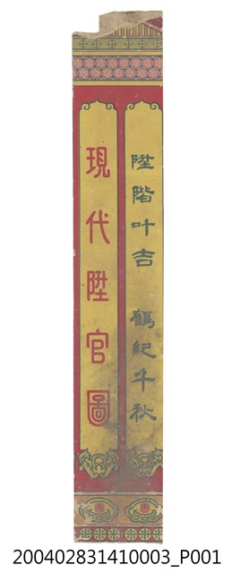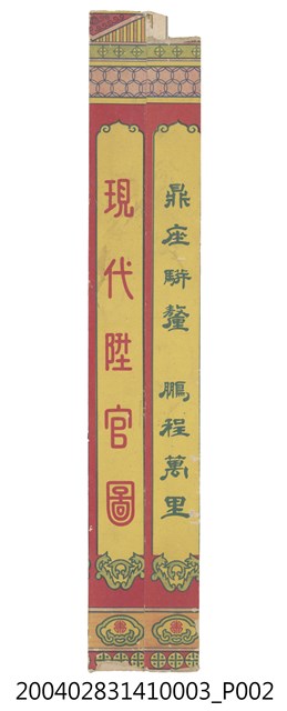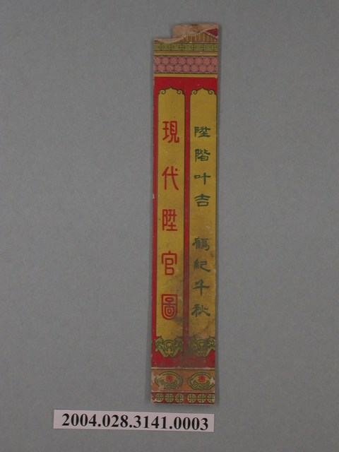 本物件為登錄號2004.028.3141中的遊戲封套,為現代陞官圖遊戲的包裝。此包裝為彩色印刷,上下皆有花紋,上半部為黃色、綠色、粉色不同形狀的花紋,下半部為綠色、黃色、紅色所組成的不同花樣。中間這段以黃色與紅色為主,有個類似像紙卷的裝飾來襯托遊戲的名稱,正中間寫著「現代陞官圖」,旁邊也有一樣的設計,只是文字改成了「鼎座駢釐,鵬程萬里」。此包裝應為立體方形,只是現在壓成扁平的方形,上面包裝有破損,邊邊也稍有磨損,中間部分則有點汙漬。