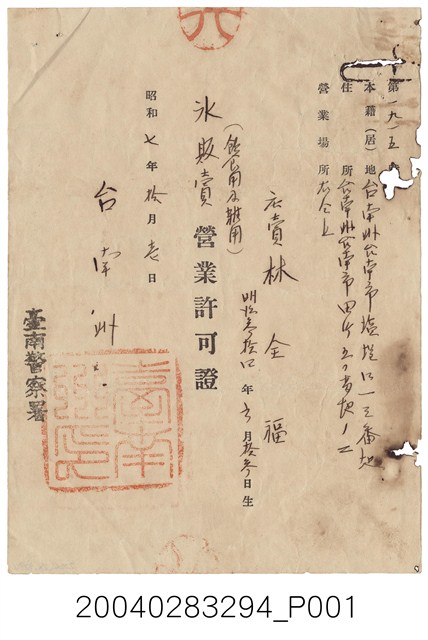 2004.028.3294 昭和7年臺南警察署冰販賣營業許可證