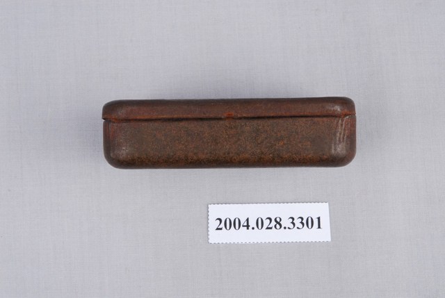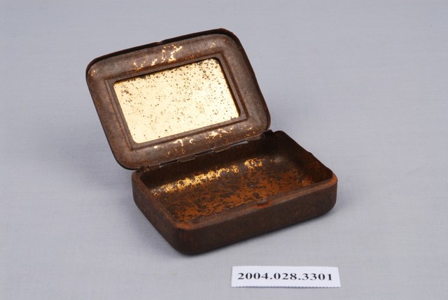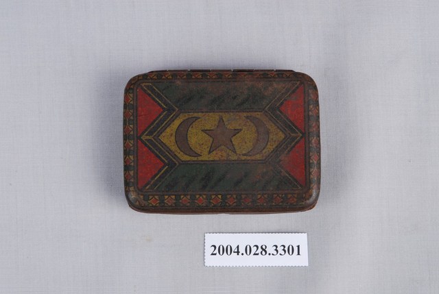 1.掀蓋式鐵製附鏡子的小鐵盒。頂蓋上方飾以金、紅、綠、黑四種顏色,中間六角形框內繪有一個五角星,左右配以兩個弦月,周邊繪以幾何形圖案以及邊框裝飾。頂蓋內部龕入一面方形鏡,盒蓋長邊的一側與盒身以鉸鍊固定且呈現仰角向上的角度,目的是方便使用者掀蓋照鏡;盒蓋的另一長邊側設計有內扣凹槽,可使盒蓋與盒身扣合後不易鬆脫。因時間久遠,盒身整體皆已嚴重鏽蝕,鏡子部分也已出現鍍銀層剝落的黑色斑點。2.由於附帶有鏡子,推測此類鐵盒主要做為收存首飾或髮飾之用。