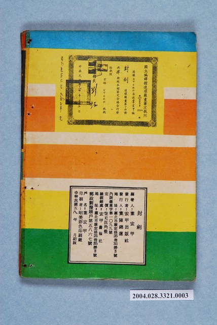 本件漫畫《封劍》第3集,封面右上角為女性側面特寫,左下角為右手持劍的男性軍人,中間有騎著馬匹揚塵的畫面,以及上方圓形尖頂的建築物,還有「葉宏甲編」、「全書四冊」、「邱國華畫」、「封劍」等文字,右下角有圓形紅底白字的「3」,背面有國立編譯館連環圖畫審定執照及版權相關訊息,外觀老舊,保存完整。