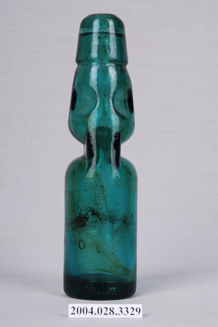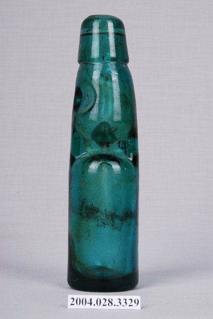 1.此件彈珠汽水瓶由藍綠色玻璃製成,玻璃厚實,整體呈瘦長圓柱形,長約5公分,寬約5公分,高約19.4公分。外型由瓶口開始向下漸寬,至中段以上有兩處圓弧凹陷造型,中段成扁身,中段以下則直筒狀至瓶底。2.彈珠汽水是日治至戰後時期十分流行的飲品之一,飲用時,需用凸字形工具於瓶口用力一拍,將瓶口的玻璃彈珠打進瓶內,便可引用清涼的汽水。飲用完畢後,瓶內的彈珠可取出,成為當時兒童間普遍的收藏品。