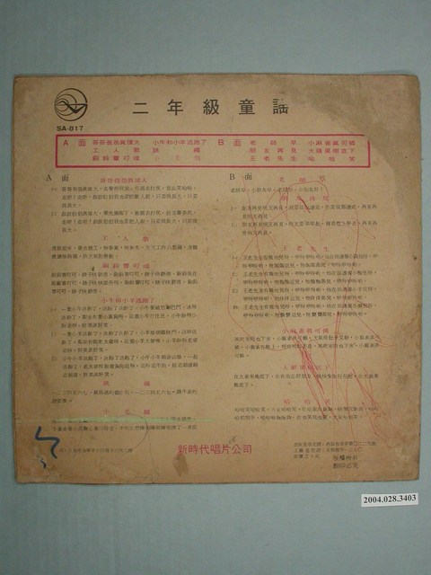 2004.028.3403 新時代唱片公司發行編號「SA-817」兒歌專輯《童謠二年級》唱片封套