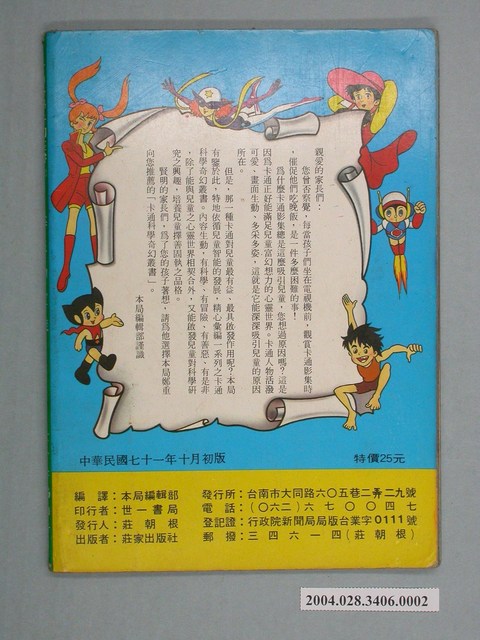 1.本件為「《湯姆歷險記 (3) 海盜的寶藏》卡通科學奇幻叢書」,封面、封底保存狀況大致完整,紙張四緣微損,封面人物為兩位主要男、女角色,封底說明世一書局發起卡通科學奇幻叢書的緣由,而封底下緣為書訊。2.《湯姆歷險記》原作為美國作家馬克.吐溫的作品 The Adventures of Tom Sawyer,此文物的出版靈感是根據日本動畫公司製作之世界名作劇場系列,第6部動畫作品,所著成的漫畫版,卡通開撥時間自1980年1月6日播至12月28日,全49集。