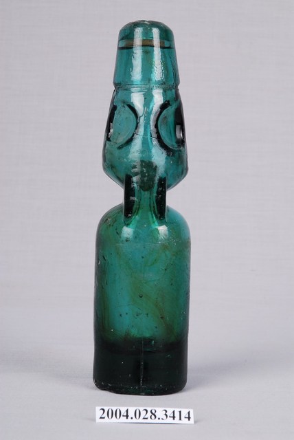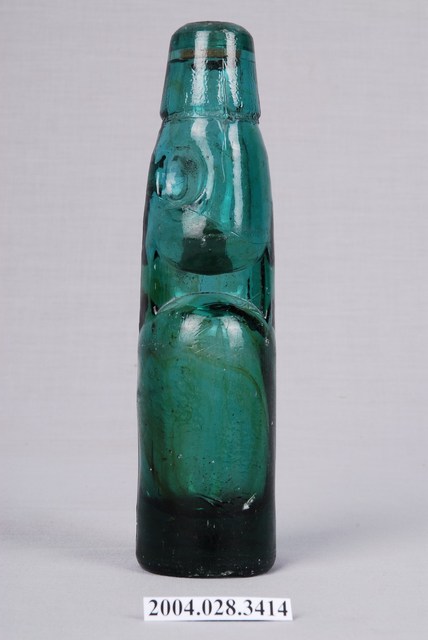 1.此件彈珠汽水瓶由藍綠色玻璃製成,玻璃厚實,整體呈瘦長圓柱形,長約4.9公分,寬約5公分,高約19.2公分。外型由瓶口開始向下漸寬,至中段以上有兩處圓弧凹陷造型,中段成扁身,中段以下則直筒狀至瓶底。2.彈珠汽水是日治至戰後時期十分流行的飲品之一,飲用時,需用凸字形工具於瓶口用力一拍,將瓶口的玻璃彈珠打進瓶內,便可引用清涼的汽水。飲用完畢後,瓶內的彈珠可取出,成為當時兒童間普遍的收藏品。
