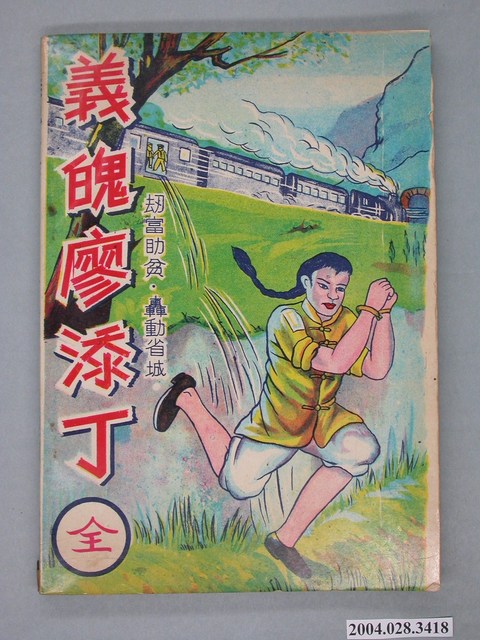 本件故事書《義魄廖添丁》的封面是被押解在火車上的廖添丁跳火車逃離的畫面,左側直書「義魄廖添丁全」、「劫富助貧、轟動省城」等字,保存完整。