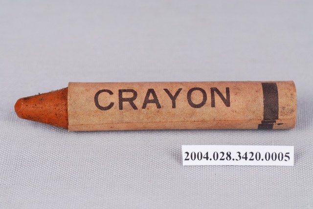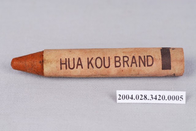 本文物為狗頭牌「褐色色蠟筆」,筆管以紙張包覆,在畫的時候不會弄髒手,且快要畫完時,可再撕一段紙,就可以繼續畫。是一般蠟筆的樣式,紙管上寫狗頭牌蠟筆、繪1隻狗以及有蠟筆的英文CRAYON字樣及HUA KOU BRAND字樣。蠟筆即是以蠟製成的筆,原料除了蠟之外,有些添加油性白堊為原料,稱為油粉彩(油性粉臘筆);若純粹以乾燥方式將顏料結合,則是一般的粉彩(粉臘筆)。