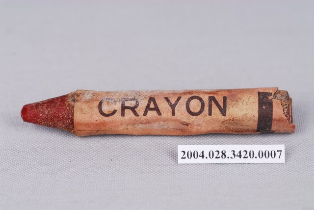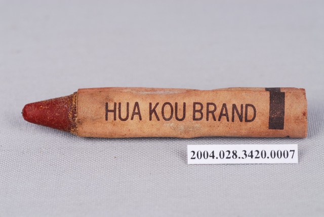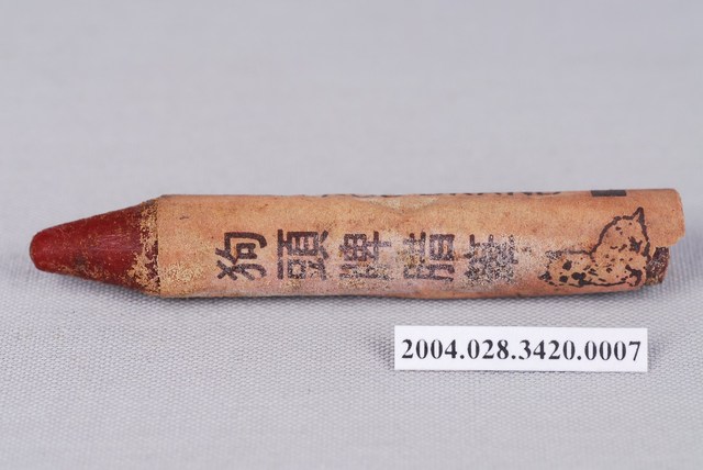 本文物為狗頭牌「紅褐色蠟筆」,筆管以紙張包覆,在畫的時候不會弄髒手,且快要畫完時,可再撕一段紙,就可以繼續畫。是一般蠟筆的樣式,紙管上寫狗頭牌蠟筆、繪1隻狗以及有蠟筆的英文CRAYON字樣及HUA KOU BRAND字樣。蠟筆即是以蠟製成的筆,原料除了蠟之外,有些添加油性白堊為原料,稱為油粉彩(油性粉臘筆);若純粹以乾燥方式將顏料結合,則是一般的粉彩(粉臘筆)。