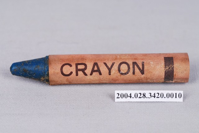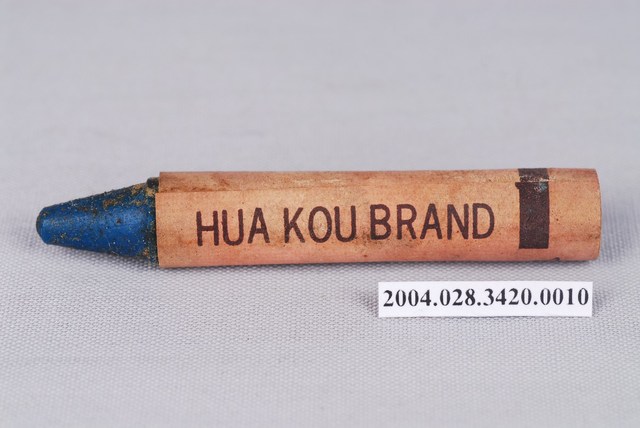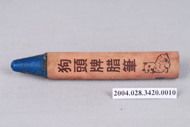 本文物為狗頭牌「藍色蠟筆」,筆管以紙張包覆,在畫的時候不會弄髒手,且快要畫完時,可再撕一段紙,就可以繼續畫。是一般蠟筆的樣式,紙管上寫狗頭牌蠟筆、繪1隻狗以及有蠟筆的英文CRAYON字樣及HUA KOU BRAND字樣。蠟筆即是以蠟製成的筆,原料除了蠟之外,有些添加油性白堊為原料,稱為油粉彩(油性粉臘筆);若純粹以乾燥方式將顏料結合,則是一般的粉彩(粉臘筆)。