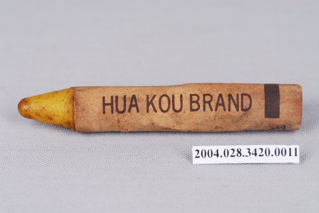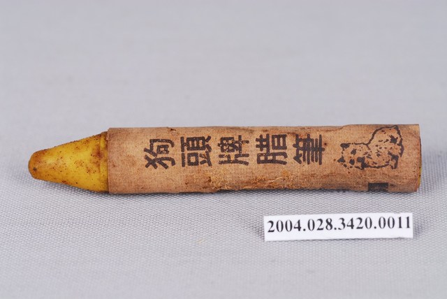 本文物為狗頭牌「黃色蠟筆」,筆管以紙張包覆,在畫的時候不會弄髒手,且快要畫完時,可再撕一段紙,就可以繼續畫。是一般蠟筆的樣式,紙管上寫狗頭牌蠟筆、繪1隻狗以及有蠟筆的英文CRAYON字樣及HUA KOU BRAND字樣。蠟筆即是以蠟製成的筆,原料除了蠟之外,有些添加油性白堊為原料,稱為油粉彩(油性粉臘筆);若純粹以乾燥方式將顏料結合,則是一般的粉彩(粉臘筆)。
