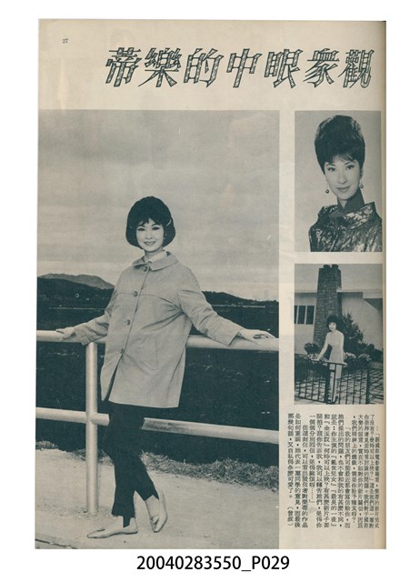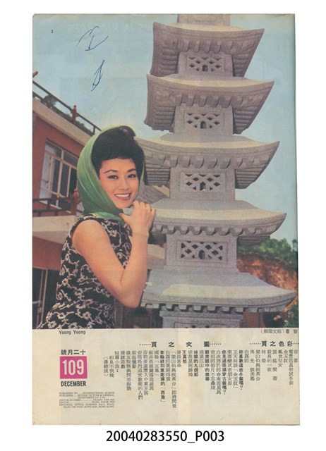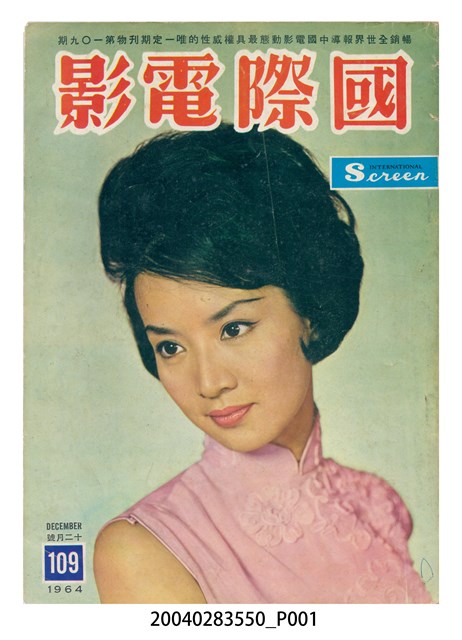 本文物為國際電影雜誌第109期,出版者為國際電影畫報社,為民國五十三年十二月號。封面上方印「暢銷全世界報導中國電影動態最具權威性的唯一定期刊物第一○九期」、「國際電影」、「INTERATIONAL Screen」。左下角印「DECEMBER」、「十二月號」、「109」、「1964」。封面人物為尤敏,其著粉紅色繡花旗袍,似回眸淺笑。背面為柯達相機之宣傳廣告。目錄頁為彩頁,上方為演員容蓉照,其頭圍綠色圍䋻,身上黑底白色圖案連身洋裝,輕靠石燈籠,右手置於石燈籠簷邊。目錄頁下方為目錄,包含「容蓉」、「電懋明星初試冬裝」、「金玉奴」、「亂世兒女」等33則報導。版權頁左部為版權相關資訊,右部則為幸運讀者之照片。