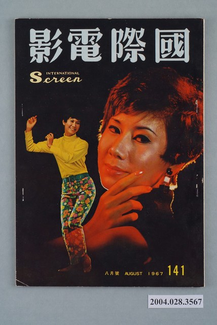 本文物為國際電影雜誌第141期,出版者為國際電影畫報社,為民國五十六年八月號。封面上方印「國際電影」、「INTERATIONAL Screen」。左下角印「八月號」、「AUGUST」、「1967」、「141」。封面人物為江虹,分為左右兩個部分,右方為江虹半身照,其右手輕撫臉頰。左方則為全身照,穿著黃色高領上衣,綠色花草長褲,做舞動姿態。背面為雷達表之宣傳廣告。目錄頁附有八枚圓形照片,為各藝人照片。左方為目錄,包含「樂蒂 陳曼玲 白冰」、「康妮 周萱」、「俞普慶飛日考察電影事業、「封面明星:江虹為愛犬完婚」等32則報導。版權頁上方為幸運讀者之照片,下方為版權相關資訊。